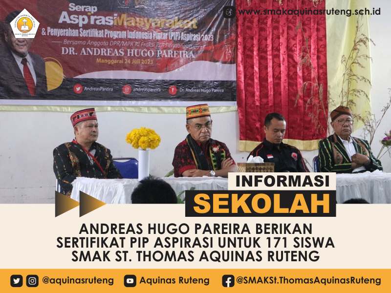 Ruteng, 26 juli 2023 – Anggota Dewan Perwakilan Rakyat Republik Indonesia (DPR RI) dari daerah pemilihan Nusa Tenggara Timur (NTT), Andreas Hugo Pareira, dengan penuh semangat melaksanakan tugasnya dalam mendukung pendidikan di wilayahnya. Pada hari Rabu, 24 Juli 2023, beliau memberikan sertifikat Program Indonesia Pintar (PIP) Aspirasi kepada 171 siswa SMAK ST. Thomas Aquinas Ruteng.