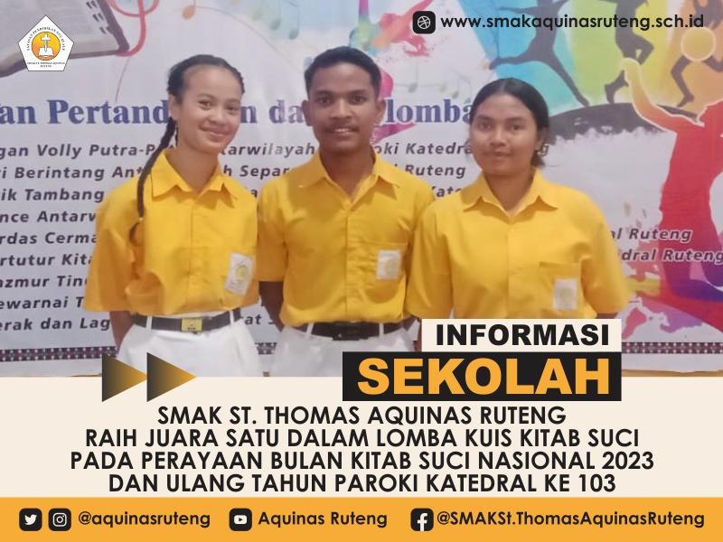 SMAK St. Thomas Aquinas Ruteng meraih kehormatan luar biasa sebagai juara 1 dalam Lomba Kuis "Kitab Suci" yang diselenggarakan dalam rangka Perayaan Bulan Kitab Suci Nasional 2023 dan Ulang Tahun Paroki Katedral ke 103. Acara yang diadakan pada tanggal 10 Oktober 2023 ini menjadi momen bersejarah yang membanggakan bagi sekolah.