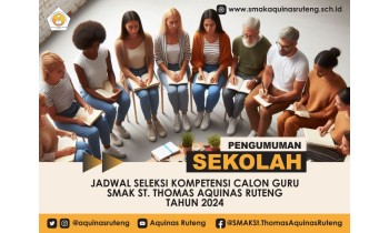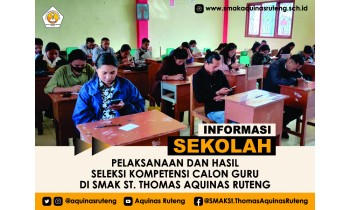 Pelaksanaan Seleksi Kompetensi Calon Guru di SMAK St. Thomas Aquinas Ruteng yang dilaksanakan pada Kamis, 18 Januari 2024, berjalan lancar dan sukses. Seleksi diikuti oleh 228 peserta dari 293 peserta pelamar calon guru di SMAK St. Thomas Aquinas Ruteng. ...