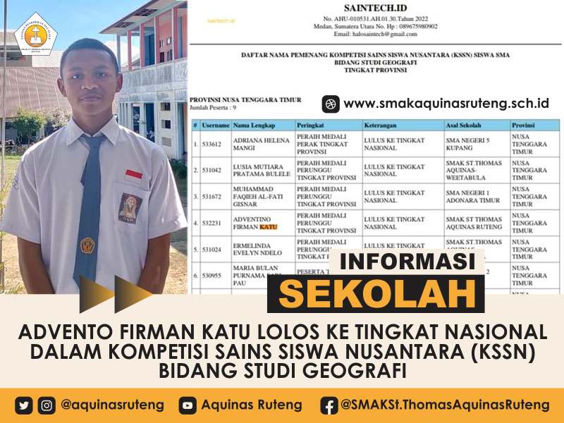 SelengkapnyaSMA Katholik St. Thomas Aquinas Ruteng kembali membanggakan dengan prestasi gemilang yang diraih oleh salah satu siswanya. Advento Firman Katu, siswa berprestasi dari sekolah tersebut, berhasil me ...