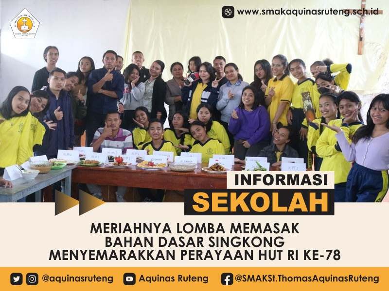 SelengkapnyaRuteng, 20 Agustus 2023 - Dalam rangka memeriahkan perayaan Hari Ulang Tahun Republik Indonesia yang ke-78, SMAK St. Thomas Aquinas Ruteng menggelar Lomba Memasak dengan bahan dasar utama "Singkong". Lomba yang diikuti oleh siswa-siswa berbakat dari berbagai kelas ini berhasil...